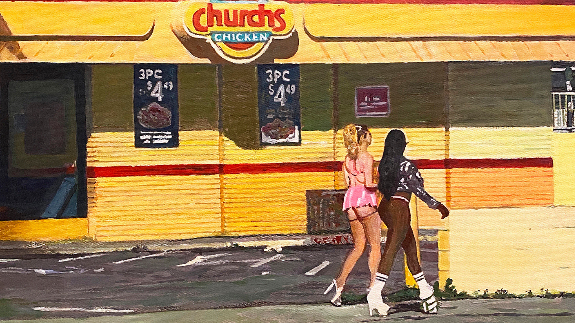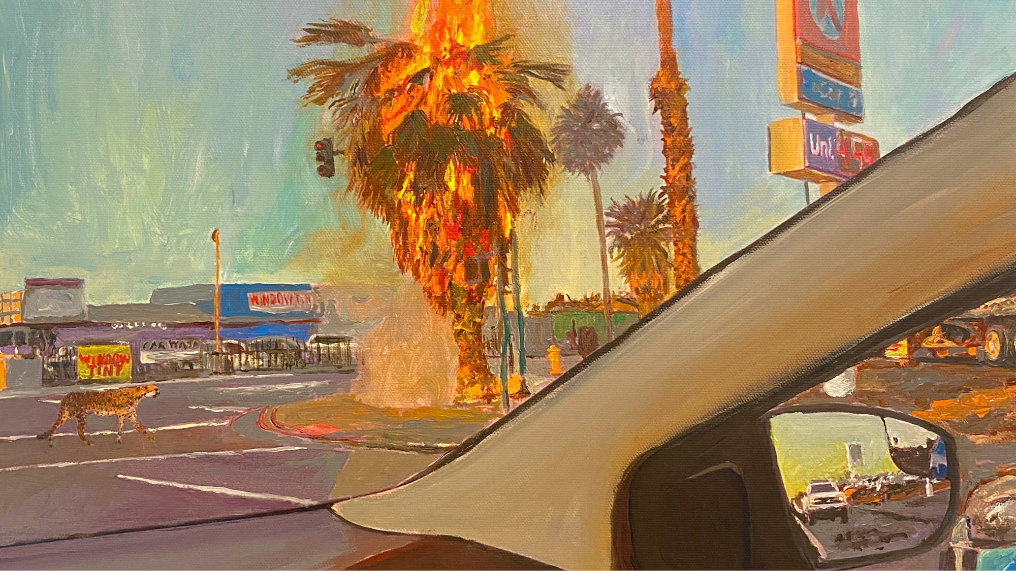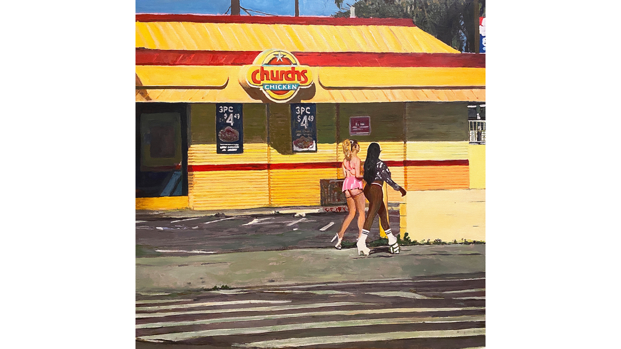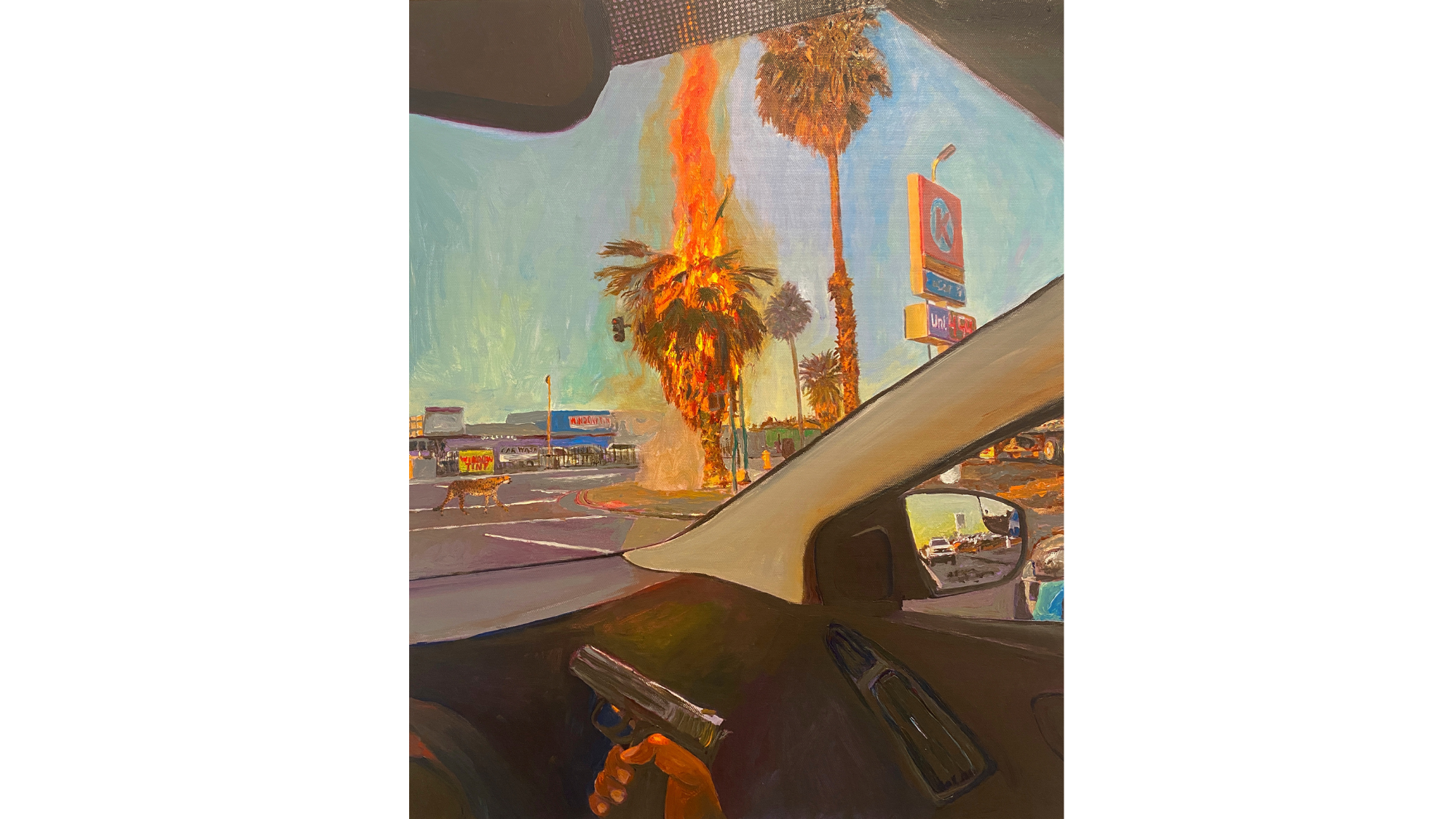 If psychosis is a breakdown of meaning, what my paintings attest to is how deviancy, addiction, fantasy and dreams of destruction are symptoms of living in a country that is impossible to make sense of. Any search for truth is betrayed by the vulgarness of life under capital. What then are we left with? My work attends to the real of the United States. If anything, the paintings are enchanted and perturbed by the strange beauty of the absurdity, isolation, addiction and horror that haunts this country.